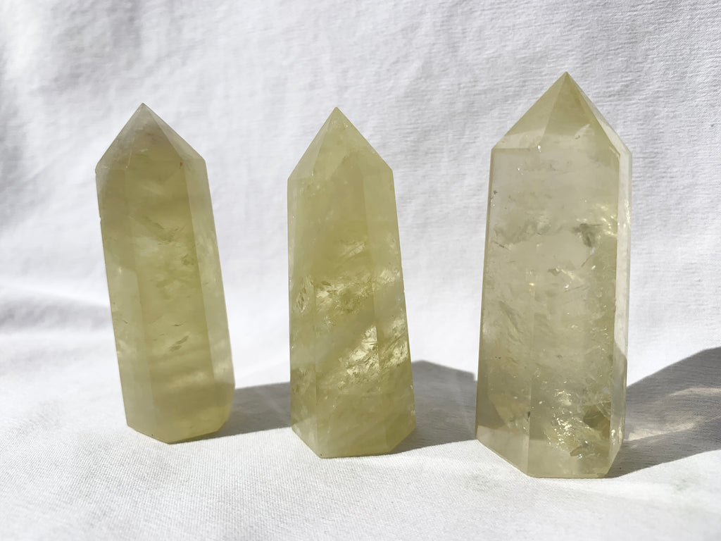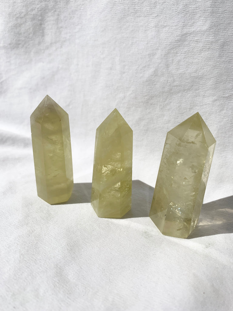 We will intuitively choose a Lemon Quartz point for you as each crystal is unique - just like you. The towers pictured are an indication of the pieces we have in stock and all carry the energy you are seeking.