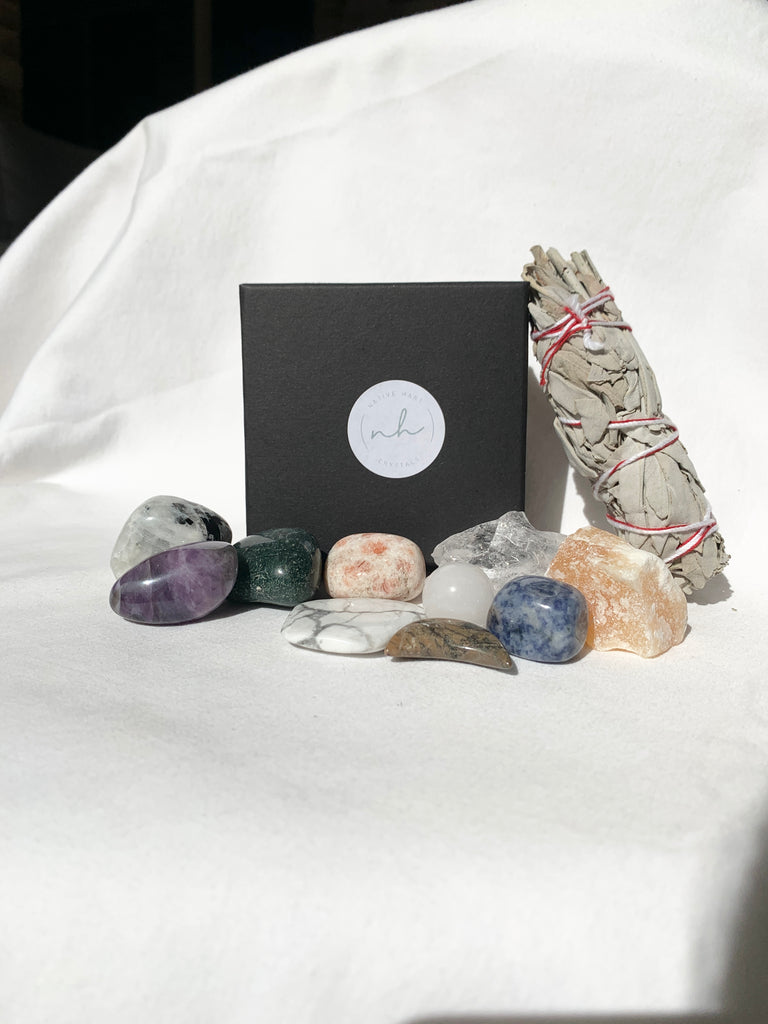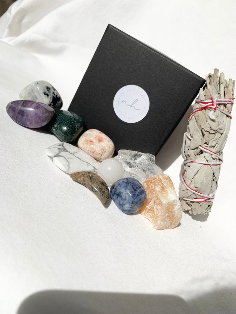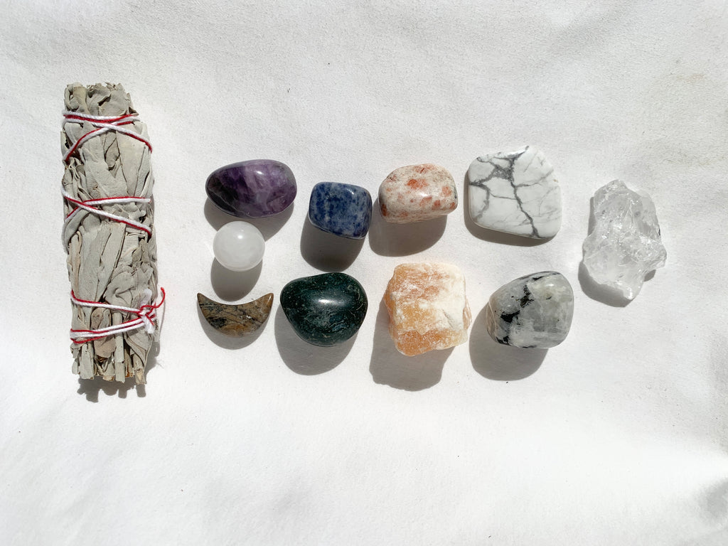Contained in this bundle is 6 tumbled stones, 2 raw chunks, 1 mini sphere, 1 moon carving and 1 sage cleansing stick. This is an indication of the bundle you will receive - complete with gift box. You will not be disappointed - it is truly the bundle for everyone.