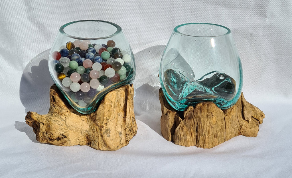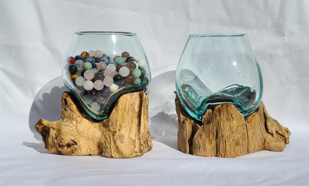Gorgeous conversation piece for your decore. Stunningly unique as the glass has been blown to contour and slump over the contours of each driftwood. They are made for each other.
